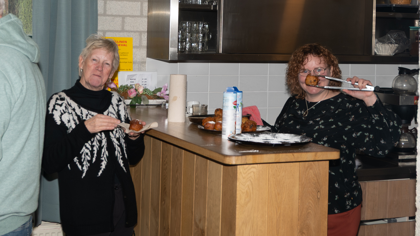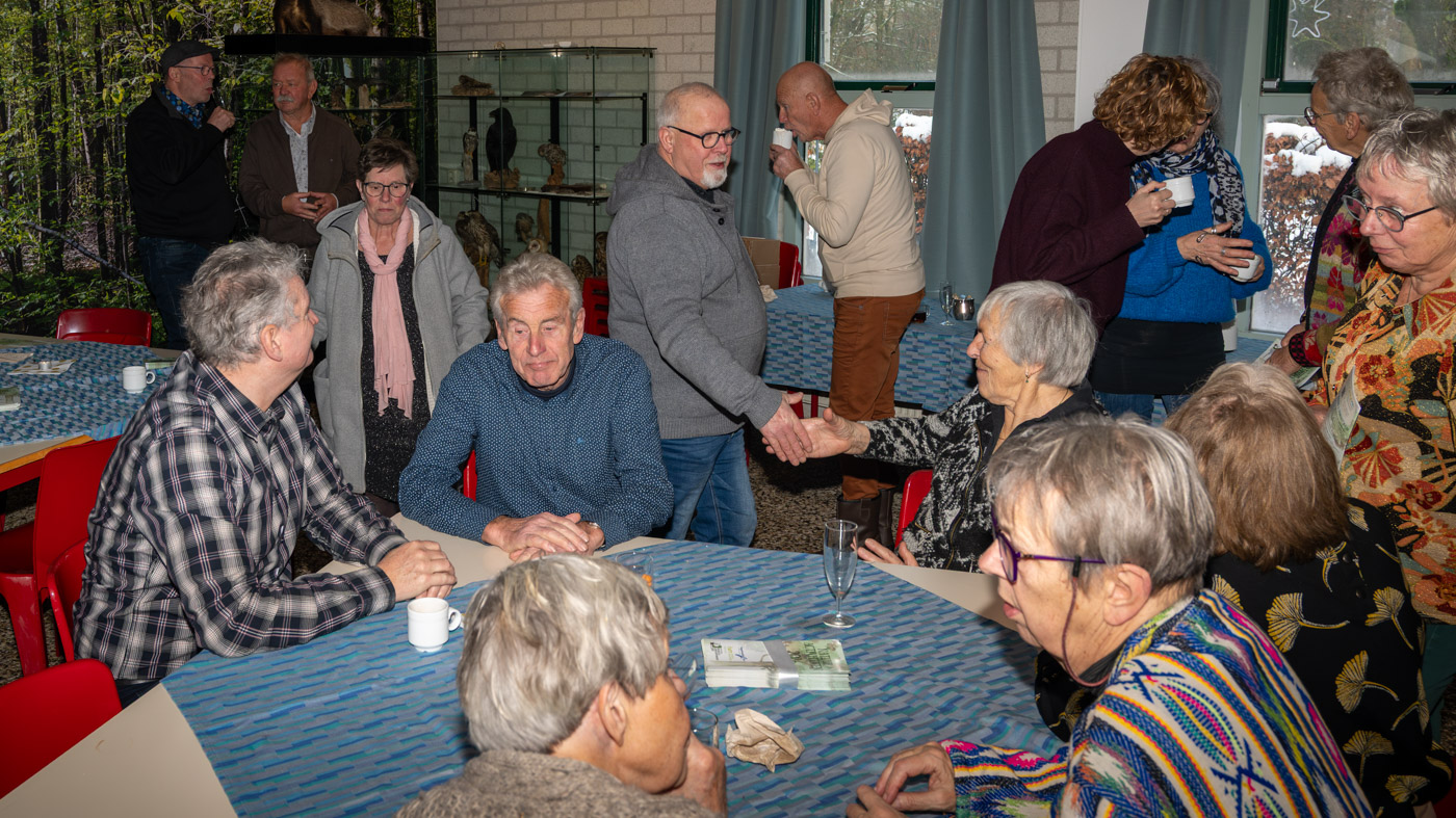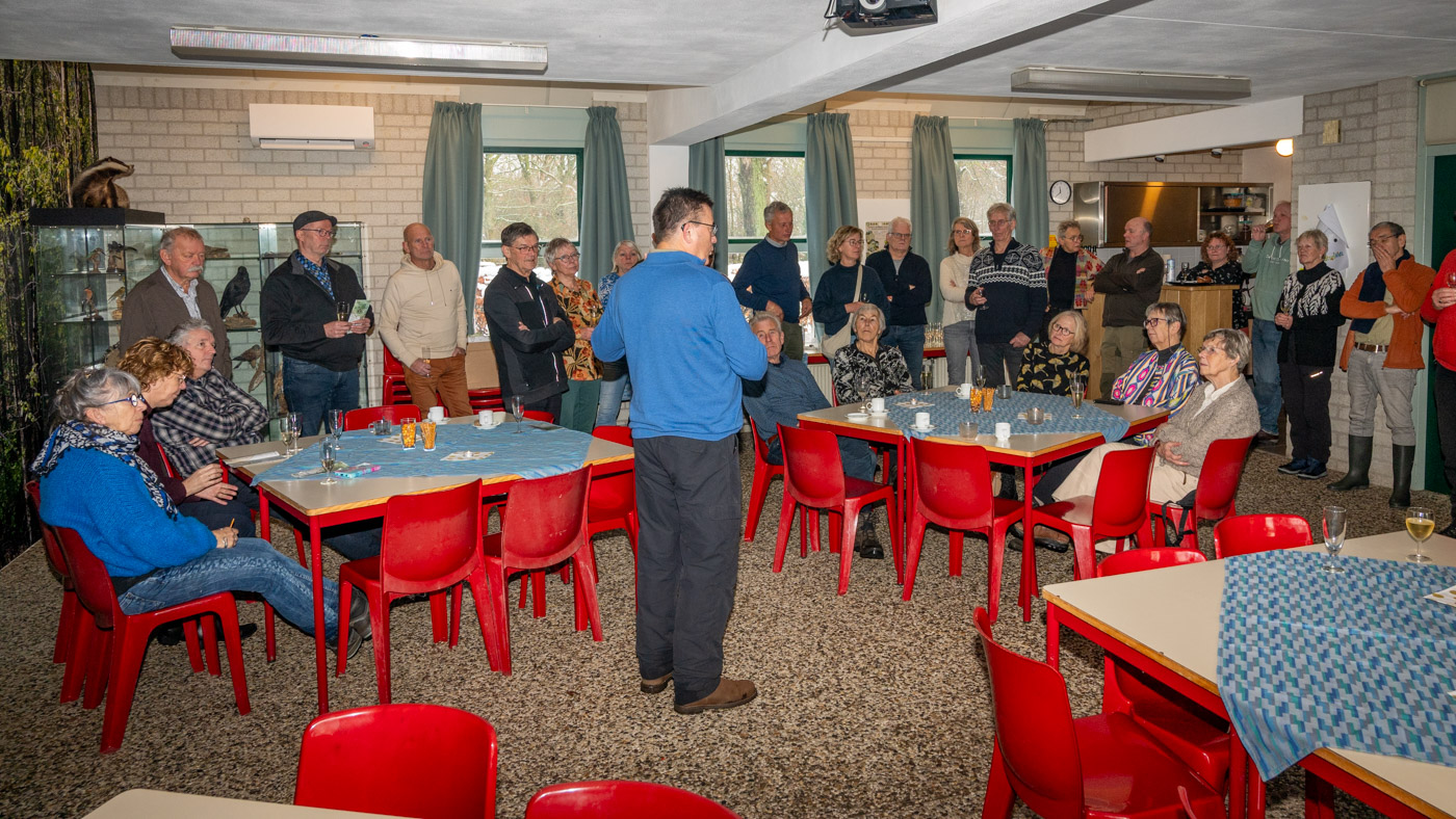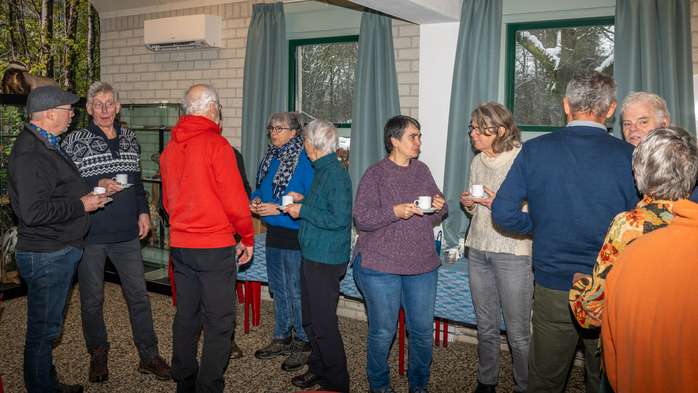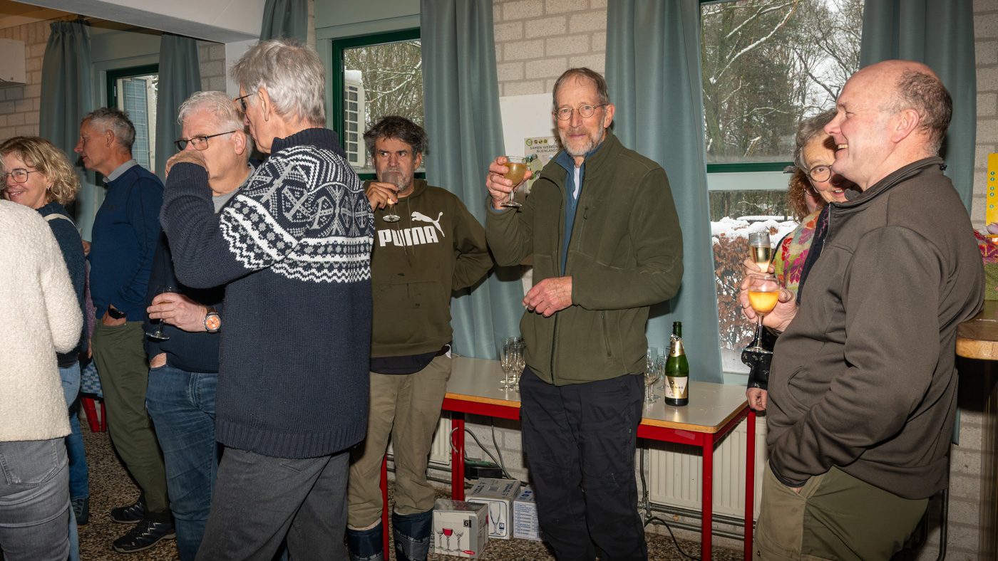 Zo tegen elf uur kwamen de wandelaars ook binnen en waren er totaal toch nog ruim 35 leden komen opdagen. Mignon van den Wittenboer had een flinke voorraad oliebollen gebakken met 3 soorten vulling erin. Die vonden met dit weer gretig aftrek. De drie voorzitters, te weten Jan-Willem Hermans, Berry Dufornee en Willem Peters hielden ieder een korte nieuwjaarstoespraak. De gezamenlijke Natuur Activiteiten folder 2026 van de drie verenigingen werd zoals gebruikelijk tijdens de nieuwjaarsreceptie weer gepresenteerd. Er is komend jaar keuze genoeg uit lezingen, wandel- en fietsexcursies en natuurwerkdagen. Daarna werden de champagneglazen gevuld en werd het glas geheven op een mooi 2026. Tot rond half een werd er onderling nog van alles besproken en daarna was de nieuwjaarsreceptie alweer voorbij en kon iedereen voorzichtig huiswaarts keren.