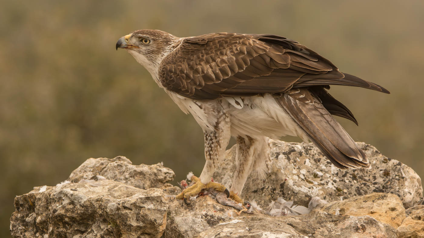 Om 7.30 werden we opgehaald om naar de eerste hut te gaan. Het doel was om de Havikarend te fotograferen. Het was nog koud en ook mistig. Een dode duif en een aangereden konijn lagen op een rots als lokvoer voor de Havikarend. Na 2 uur kwam de eerste vogel in de mist aanvliegen, een Raaf. Rond 12 uur kwam onze doelsoort aan, de Havikarend. Een mooi Havikarend ging prachtig op een dode tak zitten en liet zich fraai bekijken. Na goed rondgekeken te hebben begon hij te eten, na dit eten zat deze met volle krop nog een tijdje op de dode tak. In de omgeving zagen we verder nog een Blauwe Rotslijster, Rotszwaluwen en onze eerste Vale Gier. De Havikarend vertrok na enige tijd en vloog nog enkele rondjes rondom de hut. Na dit moois zijn we gestopt met fotograferen en hebben onze Spaanse gids gebeld om ons op te halen. Bij een lokaal café hebben we onze lunch genuttigd en konden we naar de volgende fotolocatie.