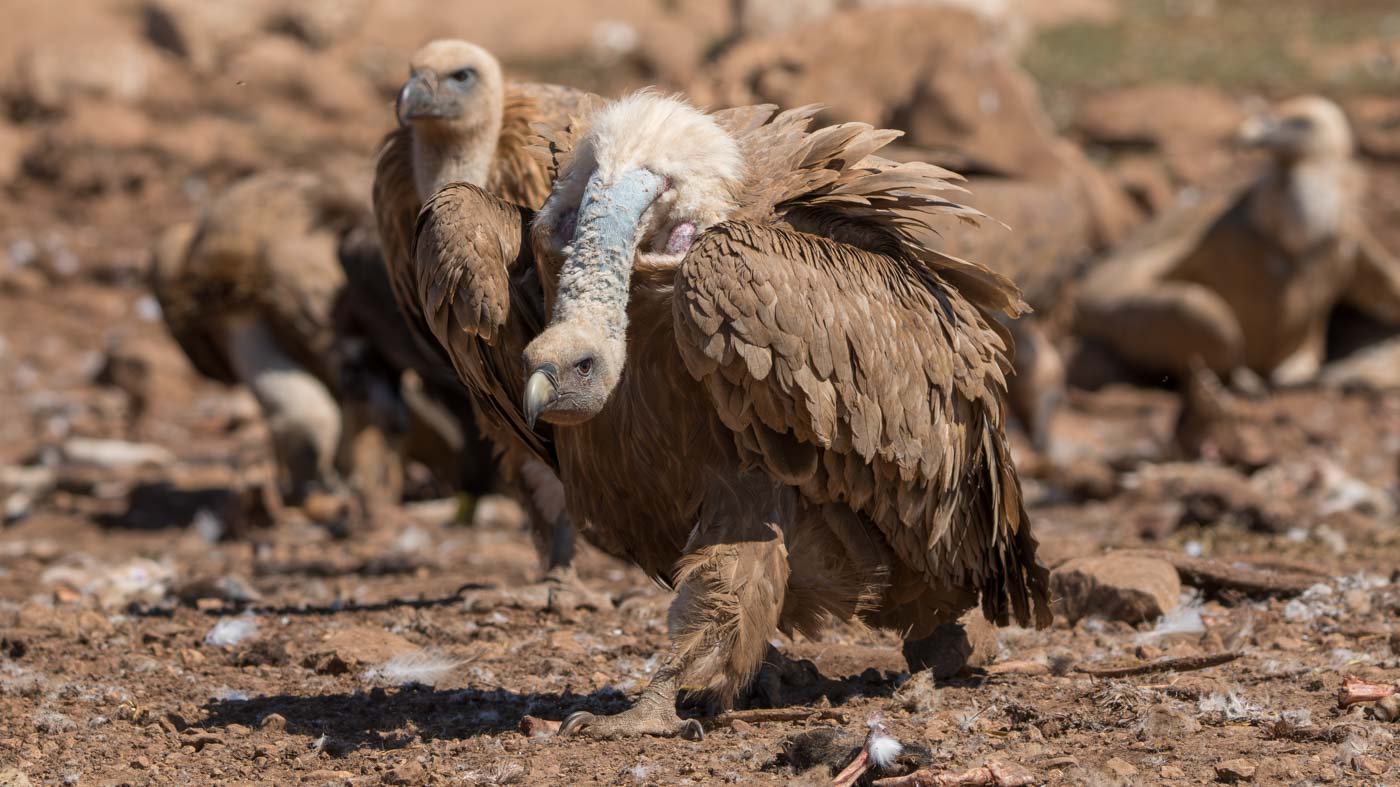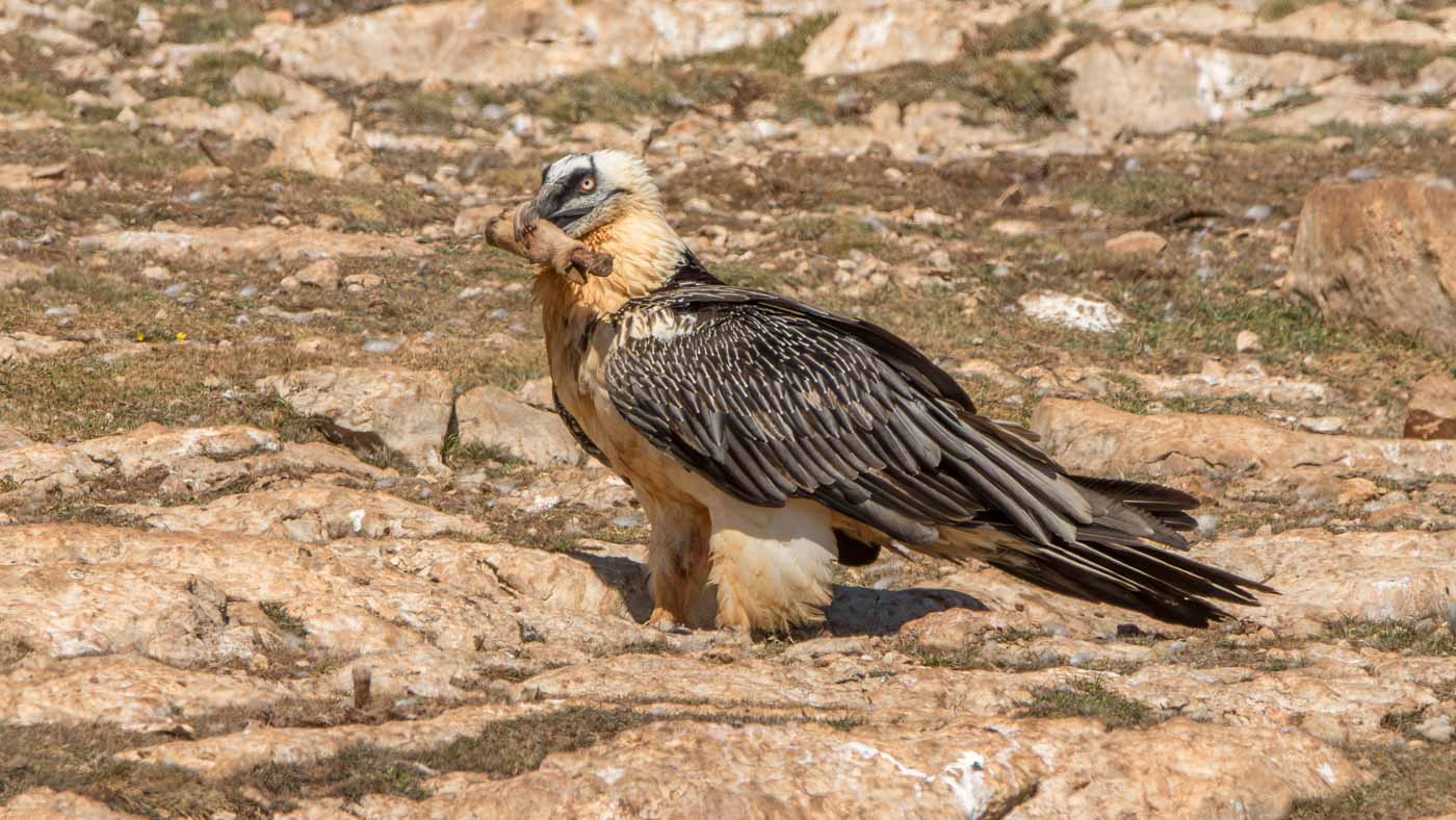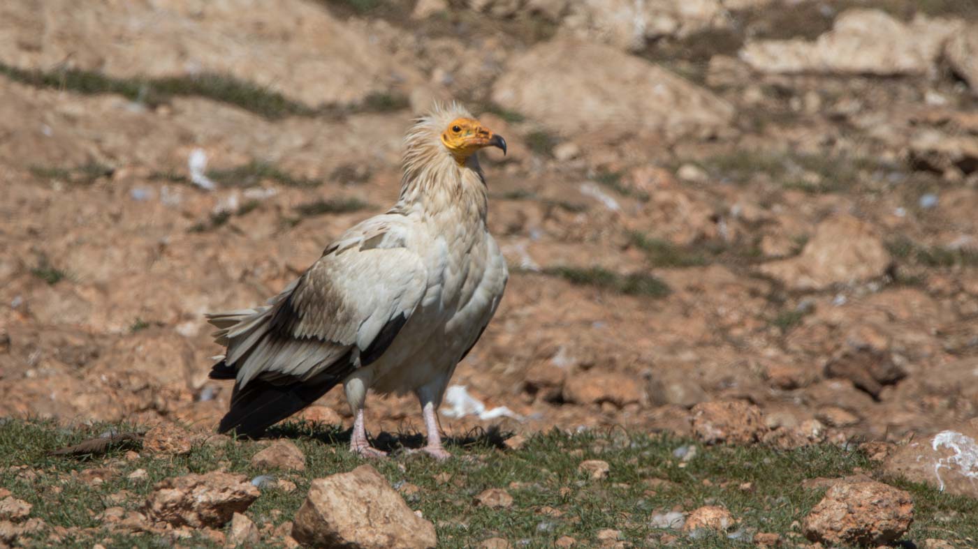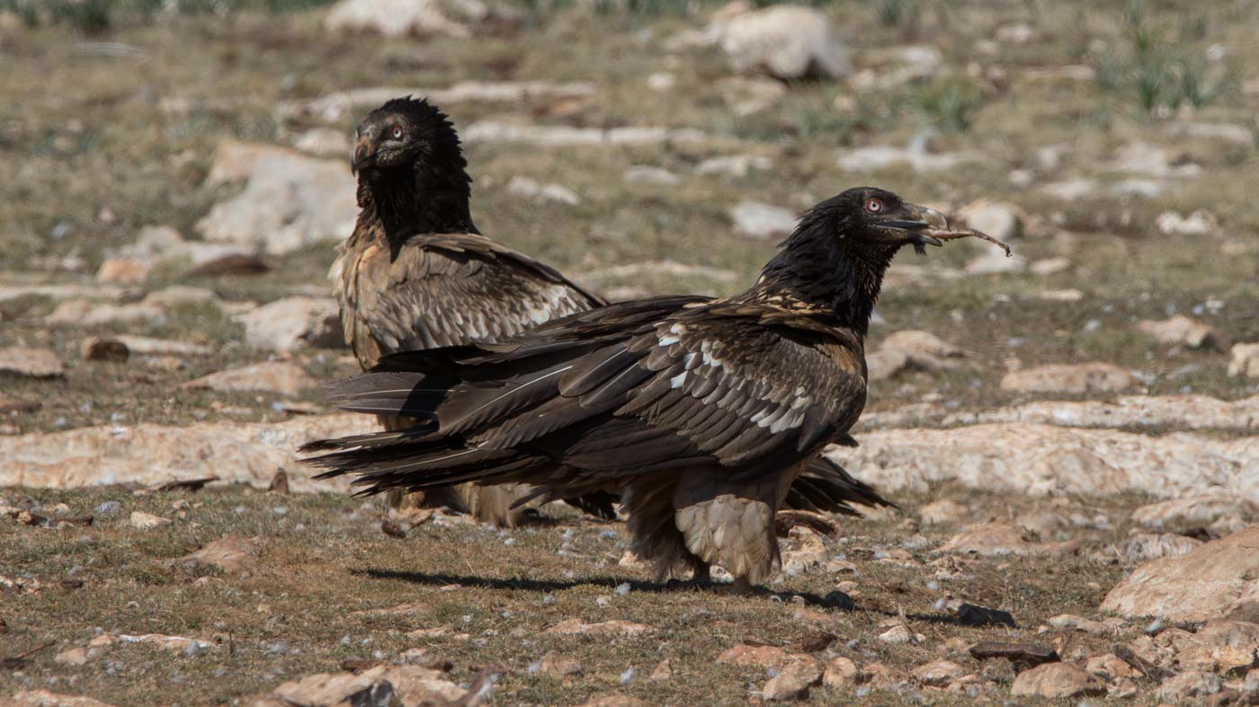Ook deze ochtend werden we opgehaald door een ranger. Met een grote Jeep stond hij voor ons hotel. Voor het hotel zat nog prachtig een koppeltje Rotsmussen. De rit was een uur rijden de bergen in in bergregio "Boumort". Via allerlei zand en grintpaden slingerden we omhoog. Onderweg zagen we prachtige vergezichten. Aan de top van een heuvel kwamen we aan bij een klein stenen gebouwtje. Dit was ons onderkomen voor deze dag. Ook hier kwamen de vele Vale Gieren op het vleesafval af. Tussen de vele Vale Gieren zaten ook een tiental Monniksgieren en een paar Aasgieren. Na een tijdje kwamen ook de eerste Lammergieren aan. Deze bleven op afstand van de groep gieren zitten. De Hiërarchie tussen de gieren is wel bijzonder om te zien. Eerst eten de Vale Gieren zoveel ze op kunnen en er letterlijk bij neervallen. Vervolgens proberen de grotere Monniksgieren een maaltje mee te pikken. En als laatste komen de Lammergieren die de botten tot zich nemen. Een deel van het slachtafval dat is neergelegd, bestaat uit speciaal uitgekozen beenderen, organen en stukken vlees waar de lammergieren en monniksgieren naar op zoek zijn. Wel apart om te zien hoe een Lammergier een groot bot inslikt en zijn hals op diverse manieren draait om het bot binnen te krijgen. De fotokaartjes raken die dag vol, wat waren de Gieren prachtig te zien en op de foto te zetten.