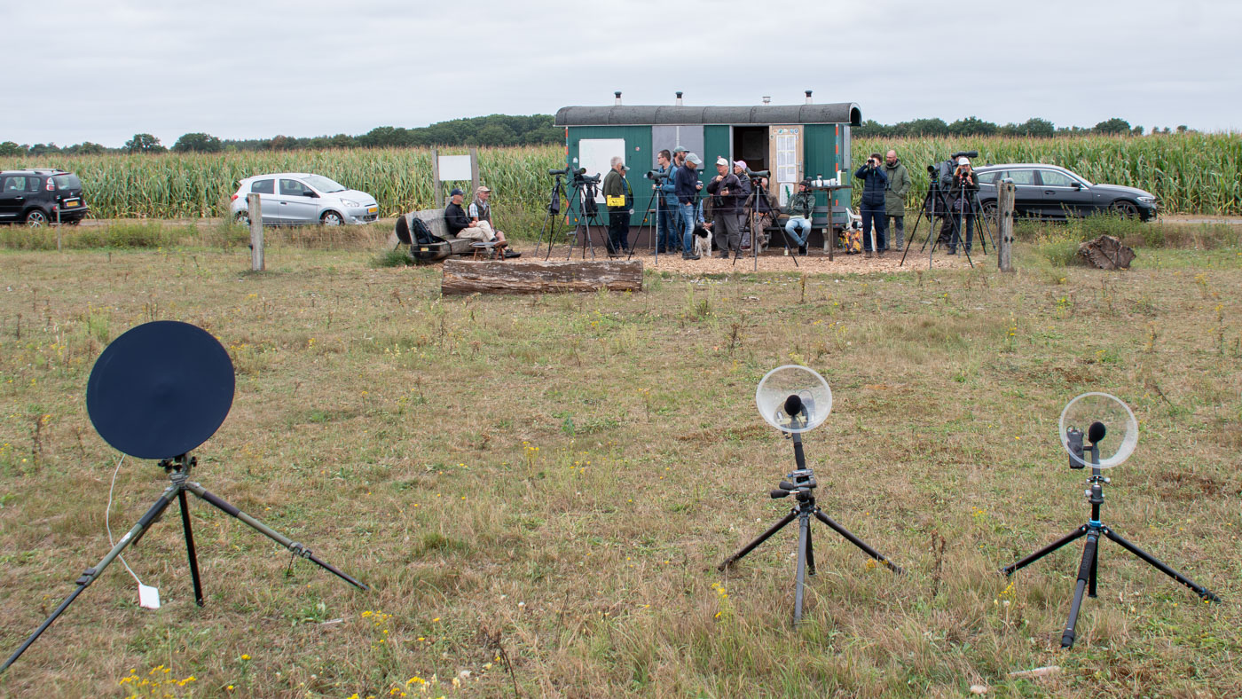 De gegevens van de trekkende vogels moeten natuurlijk wel verzameld worden. Hoe ging dat in de eerste jaren? Vanaf het begin in 2000 werd er een formulier met daarop de meest voorkomende soorten voor gebruikt. Elk uur werd er een nieuw formulier gepakt om in te vullen. Halverwege het telseizoen werd er een andere lijst gebruikt, er vliegen dan andere soorten dan in de eerste twee maanden. Deze formulieren werden mee naar huis genomen en thuis ingevoerd op de website van trektellen. Vanaf 2016 is er een app waarmee in het veld direct ingevoerd kan worden. Er zijn een aantal mensen die vaak komen tellen die op een tablet of telefoon deze app hebben staan. Sindsdien zijn de gegevens veel sneller bekend. Alle trekkende vogels (en vlinders en zelfs zoogdieren) die zichtbaar zijn worden geteld, dat kan met het blote oog zijn, met een verrekijker of met een telescoop. Op hele drukke dagen is dat een hele belevenis en de notulist heeft het ondanks de apparatuur druk. Van drie kanten (links, recht voor en rechts van de keet) worden de soorten en aantallen in hoog tempo geroepen en de soorten die echt in grote aantallen vliegen, worden met tikkers bijgehouden. Aan het eind van het uur worden de aantallen van de tikkers alsnog op de app ingevuld. Ook op geluid wordt er gedetermineerd, een goed gehoor is dus erg prettig, maar kennis van de vluchtroepjes van overtrekkende vogels is ook een grote plus. Omdat we niet alles weten worden er ook geluidsopnames gemaakt tijdens het tellen. Zoals op de foto te zien is, staat er een statief met daarop een komvormige bak (parabool) waar een microfoon in zit en een opnameapparaat. Komt er een onbekend geluid over, dan wordt er een knip in de opname gemaakt (de opname wordt even stilgezet en direct weer hervat), zodat het later thuis makkelijk is om het betreffende geluid terug te vinden. Deze opstelling staat meestal wat van de tellers af, omdat we toch aardig wat geluid maken tijdens het tellen. Het komt voor dat er drie opnameapparaten tegelijk draaien.