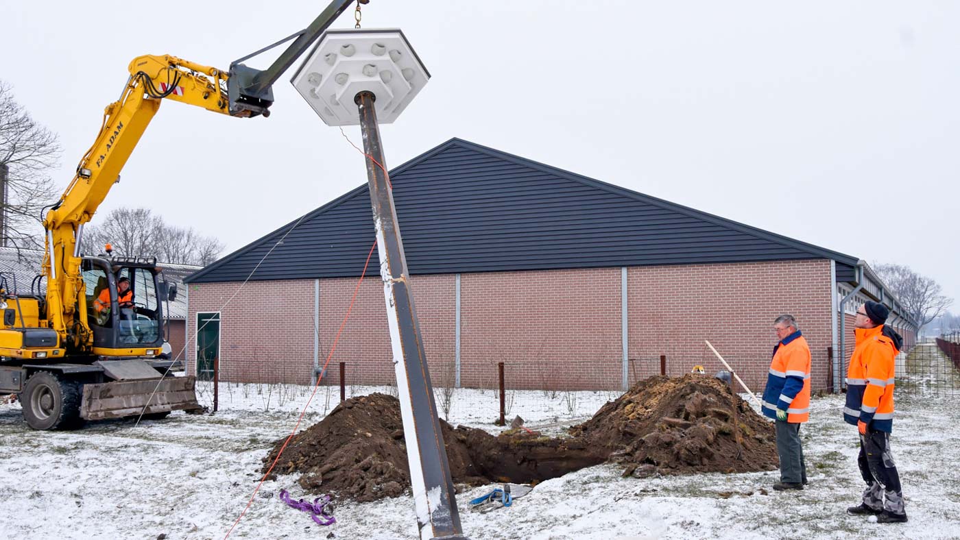 Terwijl het nog een paar graden vroor en er een laagje sneeuw lag hebben leden van de Zwaluwenwerkgroep zaterdag 3 maart 2018 de derde huiszwaluwentil geplaatst aan de Lageburchtweg in Uden.