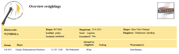 Op 4 Augustus 2025 zag ik 5 Lepelaars op de Hofmans Plassen. Ze hebben er enkele uren naar voedsel gezocht en zijn daarna weer doorgevlogen. Twee van de vijf Lepelaars hadden een witte kleurring. Een van deze kleurringen heb ik kunnen ontcijferen; NHD4.
