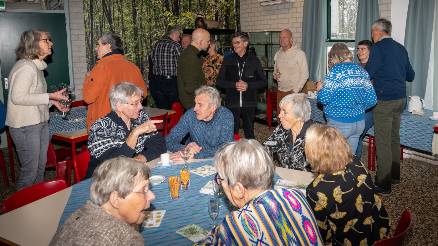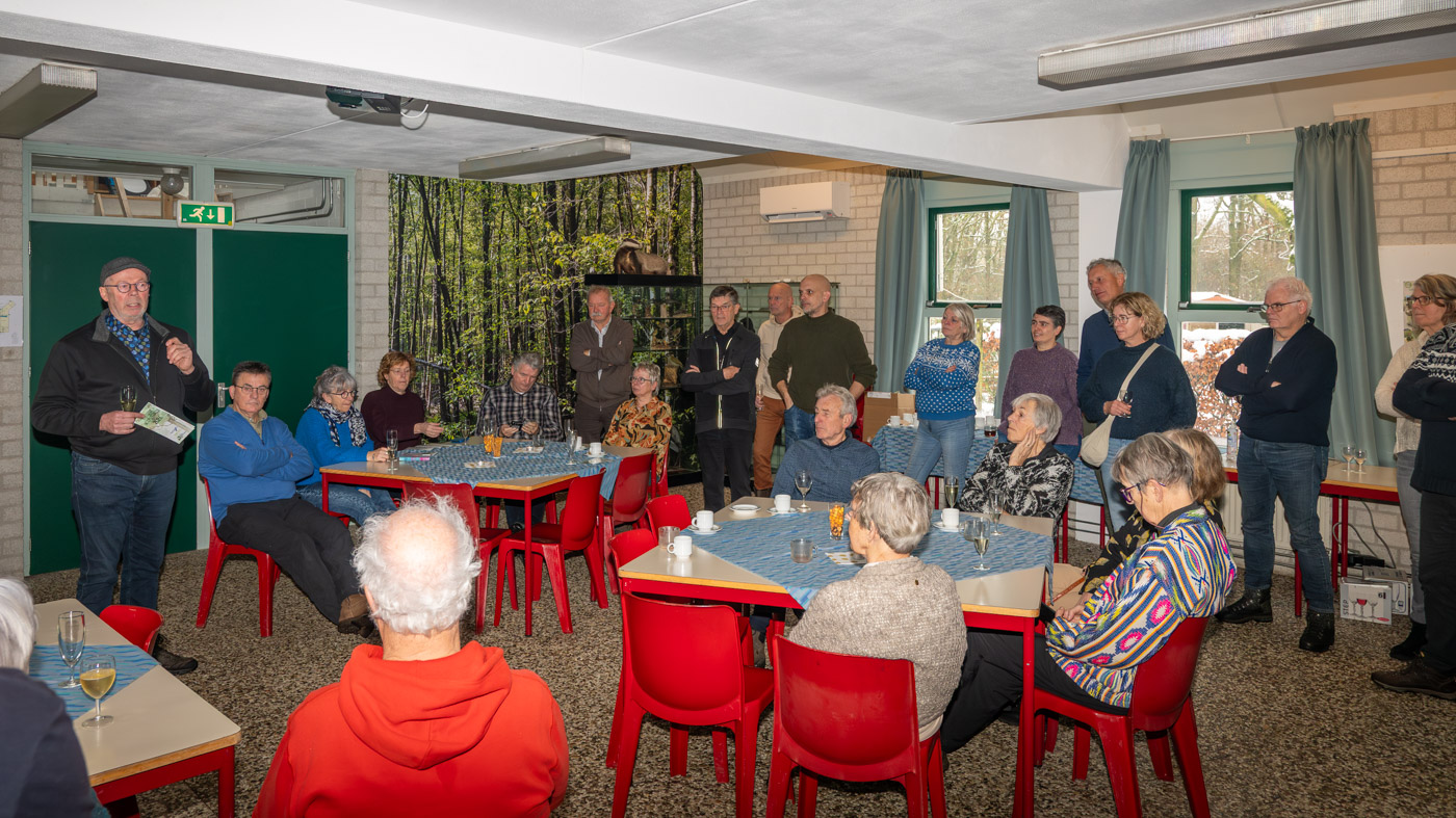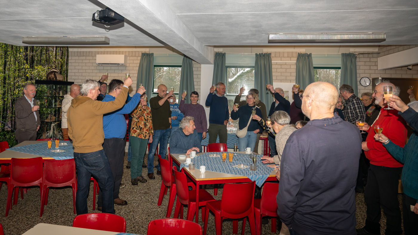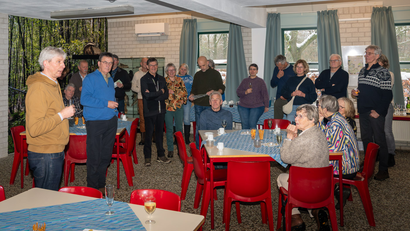 Zo tegen elf uur kwamen de wandelaars ook binnen en waren er totaal toch nog ruim 35 leden komen opdagen. Mignon van den Wittenboer had een flinke voorraad oliebollen gebakken met 3 soorten vulling erin. Die vonden met dit weer gretig aftrek. De drie voorzitters, te weten Jan-Willem Hermans, Berry Dufornee en Willem Peters hielden ieder een korte nieuwjaarstoespraak. De gezamenlijke Natuur Activiteiten folder 2026 van de drie verenigingen werd zoals gebruikelijk tijdens de nieuwjaarsreceptie weer gepresenteerd. Er is komend jaar keuze genoeg uit lezingen, wandel- en fietsexcursies en natuurwerkdagen. Daarna werden de champagneglazen gevuld en werd het glas geheven op een mooi 2026. Tot rond half een werd er onderling nog van alles besproken en daarna was de nieuwjaarsreceptie alweer voorbij en kon iedereen voorzichtig huiswaarts keren.