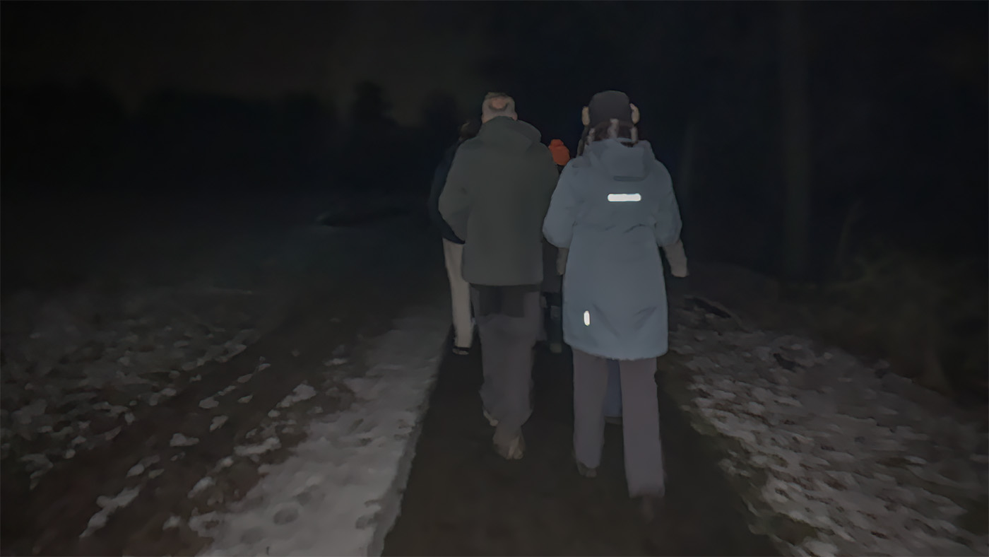 Op de parkeerplaats werden we al meteen getrakteerd op het geroep van een Bosuil in de verte. De eerste uil van deze avond. De Bosuil is de meest voorkomende uilensoort in Europa, dus de verwachting was dat we die vanavond vaker zouden gaan horen. Glibberend van de parkeerplaats af, ging de wandeling vervolgens naar de Karlingerweg. Overdag zijn daar regelmatig bij verschillende nestkasten steenuilen te zien.