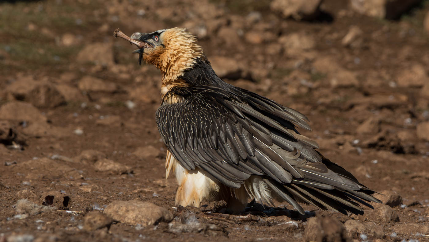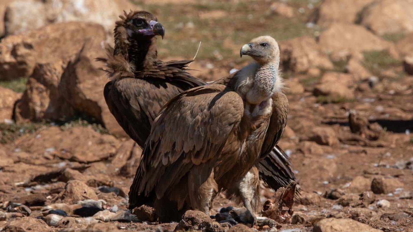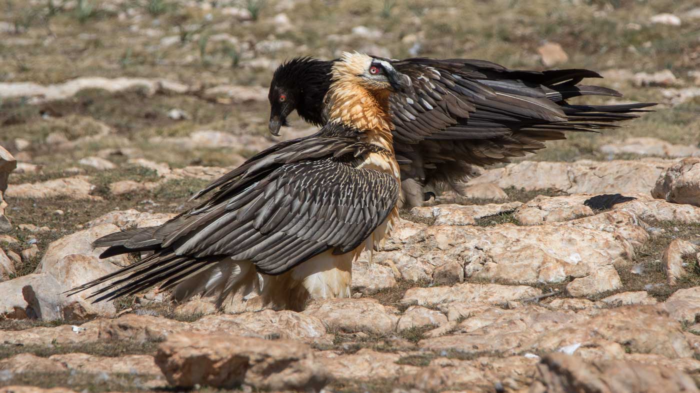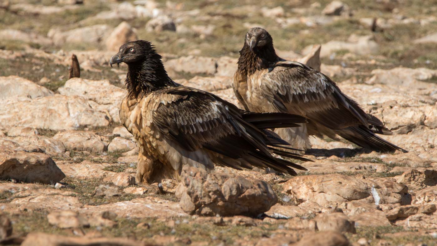 Ook deze ochtend werden we opgehaald door een ranger. Met een grote Jeep stond hij voor ons hotel. Voor het hotel zat nog prachtig een koppeltje Rotsmussen. De rit was een uur rijden de bergen in in bergregio "Boumort". Via allerlei zand en grintpaden slingerden we omhoog. Onderweg zagen we prachtige vergezichten. Aan de top van een heuvel kwamen we aan bij een klein stenen gebouwtje. Dit was ons onderkomen voor deze dag. Ook hier kwamen de vele Vale Gieren op het vleesafval af. Tussen de vele Vale Gieren zaten ook een tiental Monniksgieren en een paar Aasgieren. Na een tijdje kwamen ook de eerste Lammergieren aan. Deze bleven op afstand van de groep gieren zitten. De Hiërarchie tussen de gieren is wel bijzonder om te zien. Eerst eten de Vale Gieren zoveel ze op kunnen en er letterlijk bij neervallen. Vervolgens proberen de grotere Monniksgieren een maaltje mee te pikken. En als laatste komen de Lammergieren die de botten tot zich nemen. Een deel van het slachtafval dat is neergelegd, bestaat uit speciaal uitgekozen beenderen, organen en stukken vlees waar de lammergieren en monniksgieren naar op zoek zijn. Wel apart om te zien hoe een Lammergier een groot bot inslikt en zijn hals op diverse manieren draait om het bot binnen te krijgen. De fotokaartjes raken die dag vol, wat waren de Gieren prachtig te zien en op de foto te zetten.