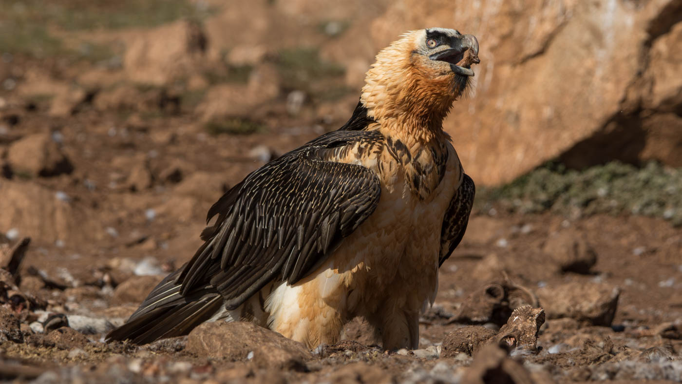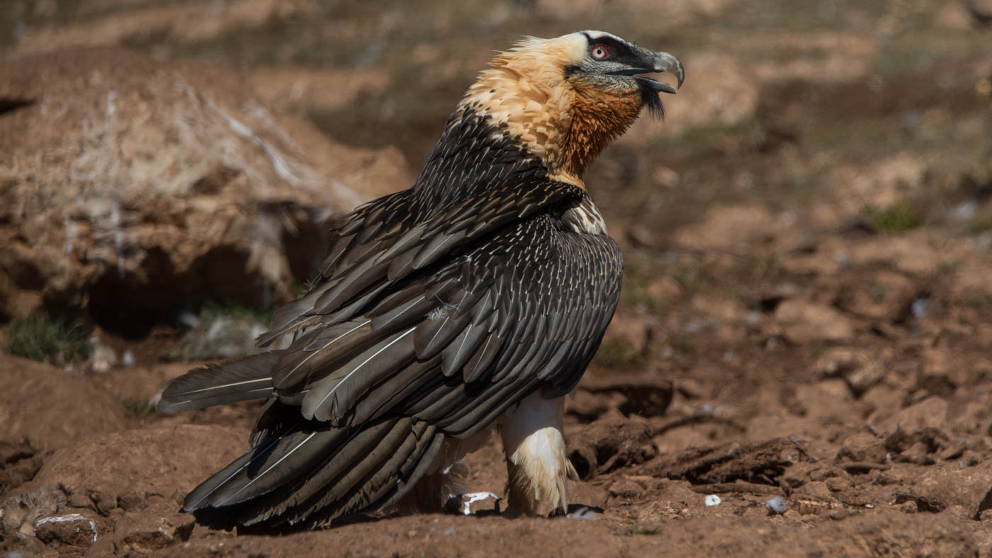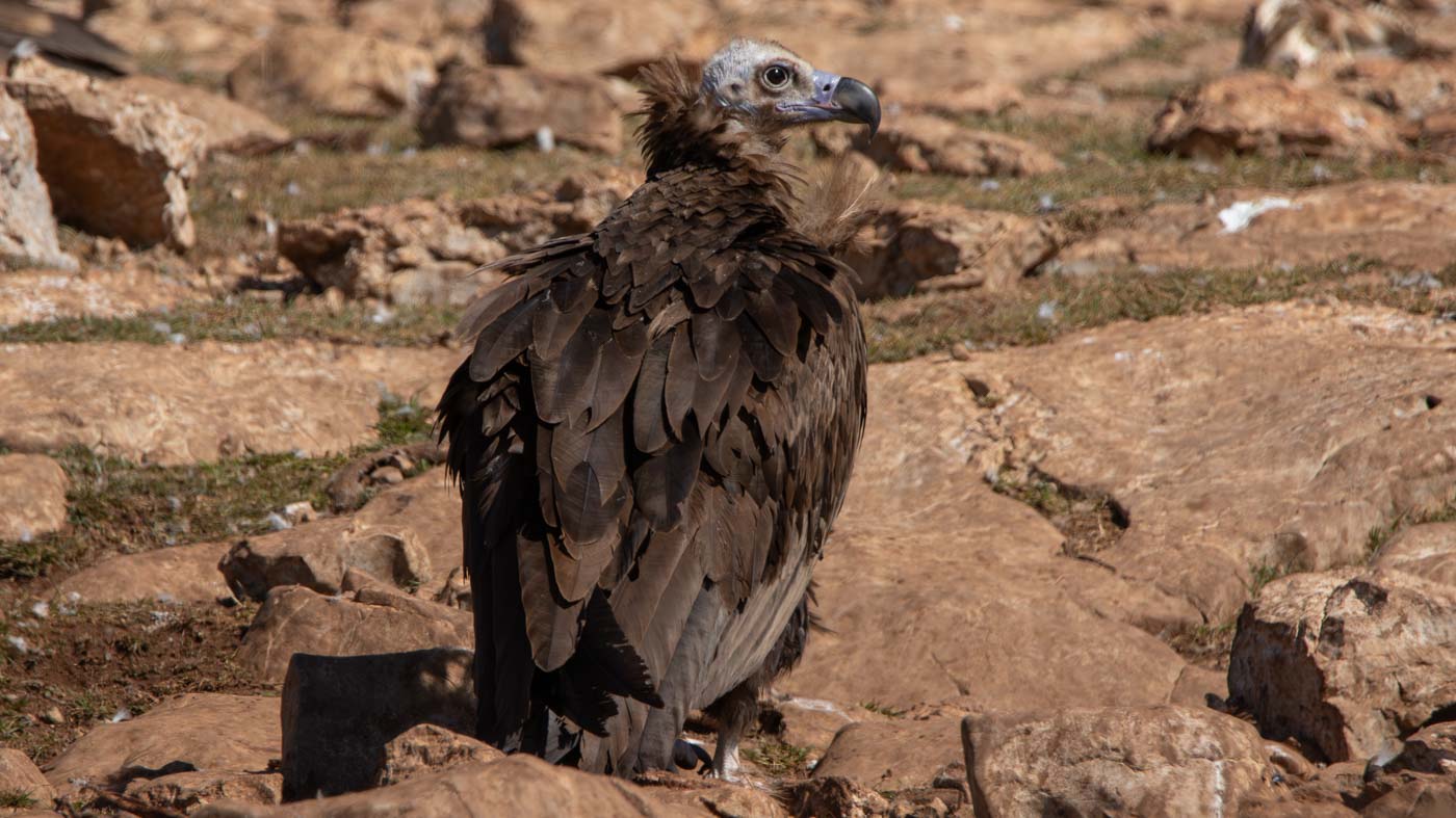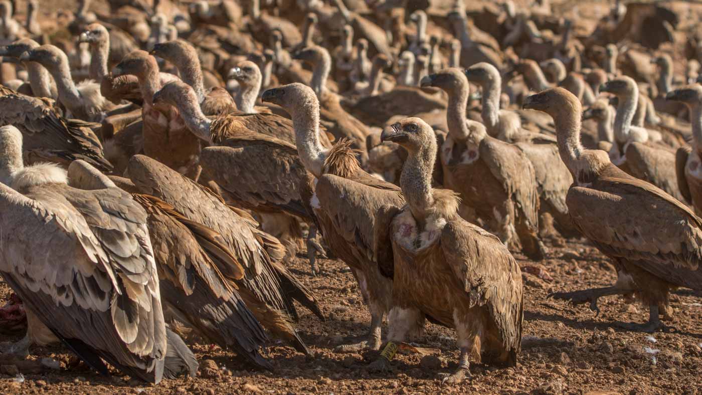 Ook deze ochtend werden we opgehaald door een ranger. Met een grote Jeep stond hij voor ons hotel. Voor het hotel zat nog prachtig een koppeltje Rotsmussen. De rit was een uur rijden de bergen in in bergregio "Boumort". Via allerlei zand en grintpaden slingerden we omhoog. Onderweg zagen we prachtige vergezichten. Aan de top van een heuvel kwamen we aan bij een klein stenen gebouwtje. Dit was ons onderkomen voor deze dag. Ook hier kwamen de vele Vale Gieren op het vleesafval af. Tussen de vele Vale Gieren zaten ook een tiental Monniksgieren en een paar Aasgieren. Na een tijdje kwamen ook de eerste Lammergieren aan. Deze bleven op afstand van de groep gieren zitten. De Hiërarchie tussen de gieren is wel bijzonder om te zien. Eerst eten de Vale Gieren zoveel ze op kunnen en er letterlijk bij neervallen. Vervolgens proberen de grotere Monniksgieren een maaltje mee te pikken. En als laatste komen de Lammergieren die de botten tot zich nemen. Een deel van het slachtafval dat is neergelegd, bestaat uit speciaal uitgekozen beenderen, organen en stukken vlees waar de lammergieren en monniksgieren naar op zoek zijn. Wel apart om te zien hoe een Lammergier een groot bot inslikt en zijn hals op diverse manieren draait om het bot binnen te krijgen. De fotokaartjes raken die dag vol, wat waren de Gieren prachtig te zien en op de foto te zetten.