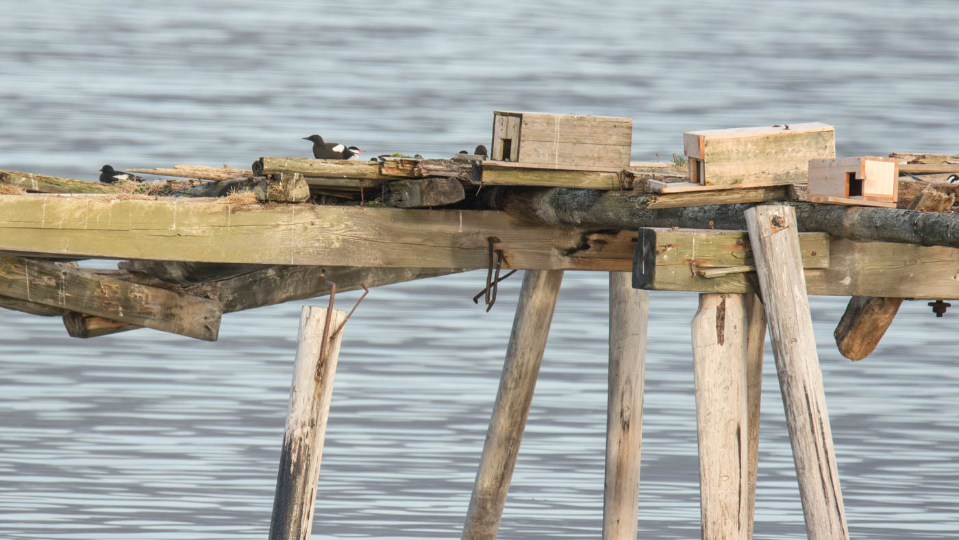 Wat verder terugwaards zagen we bij een klein plaatsje Kongsfjord een aantal Zwarte Zeekoeten op een platform zitten. Ze broedden hier samen met wat Visdieven op dit platform. Bij Tana vloog opeens een Moerassneeuwhoen over de weg. Hier zijn we natuurlijk ook even voor gestopt. Deze kwam nog een aantal keren voorbij vliegen en kon zo fraai op de foto. Bij een meertje verderop zat ook een Roodkeelduiker.
