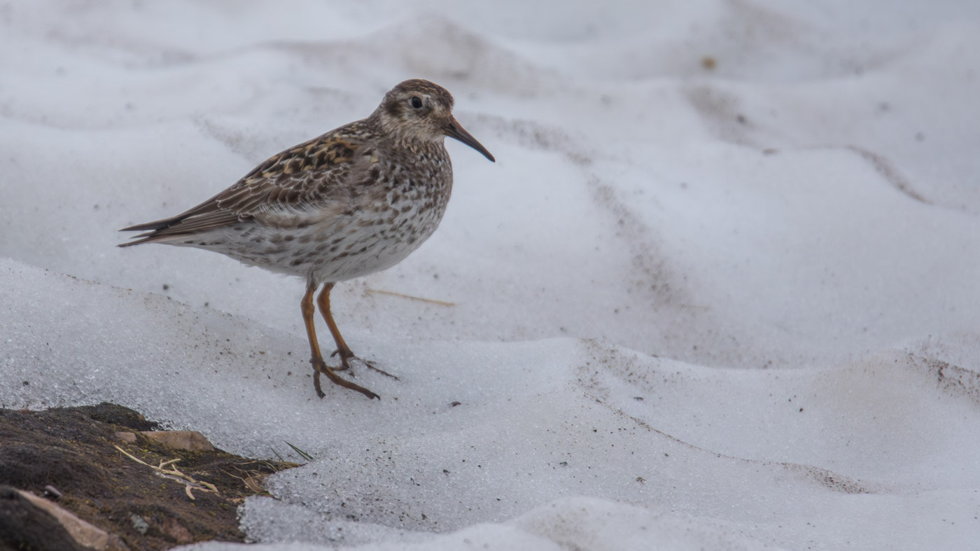 Aan de kant van de weg lag nog best wat sneeuw wat aan het smelten was. De sneeuw was wel volop aan het dooien, op deze plekken zagen we ook weer Paarse Strandlopers, Roodkeelpiepers en Bontbekplevieren. Bijzonder om deze in hun leefomgeving te zien. De Paarse Strandloper zien we vooral in de winter aan de Brouwersdam.