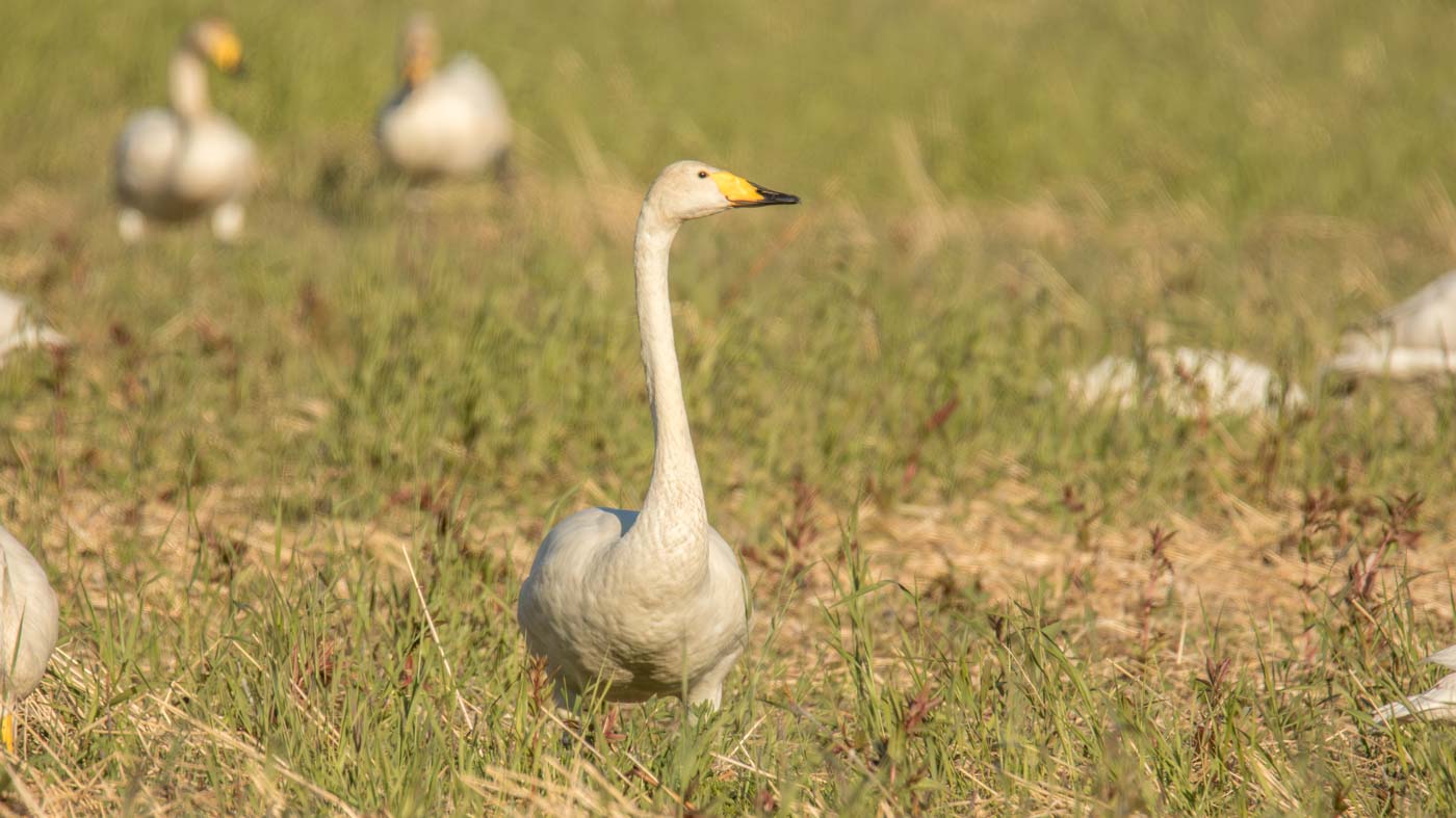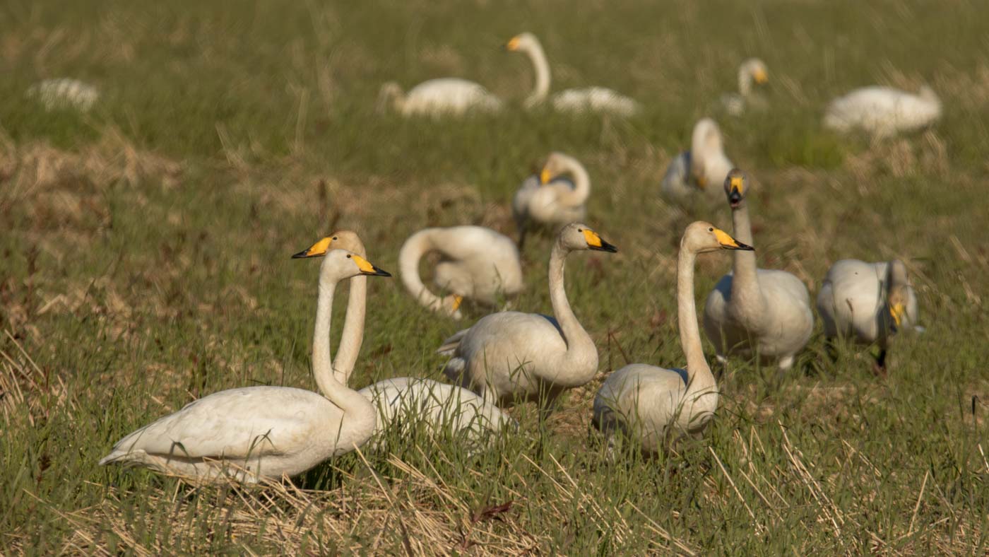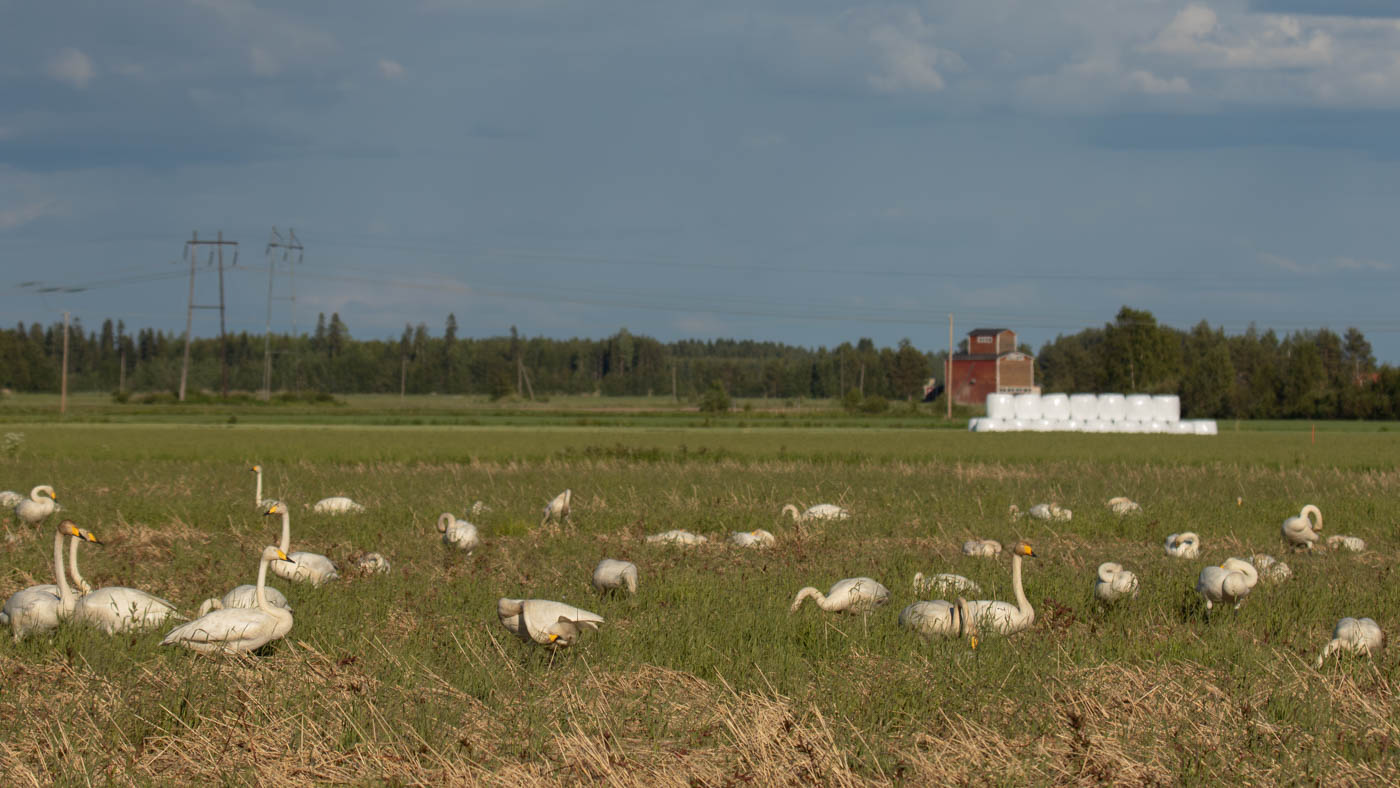 Het hotel (Finlandia airport hotel) ligt direct aan de Botnische Golf waar al diverse Kokmeeuwen rondvlogen. In de verte zagen we ook nog enkele Visdieven foerageren. Maar omdat het nog lang licht was zijn we met de auto de omgeving verder gaan verkennen. Op Observado.org hadden we al leuke waarnemingen gezien ten zuiden van Oulu. Bij Liminka zagen we een grote groep witte vogels zitten, een groep Wilde Zwanen. Toch wel mooi om onze wintergasten hier te zien. Vanuit deze plek zullen ze nog verder naar hun broedplekken gaan.