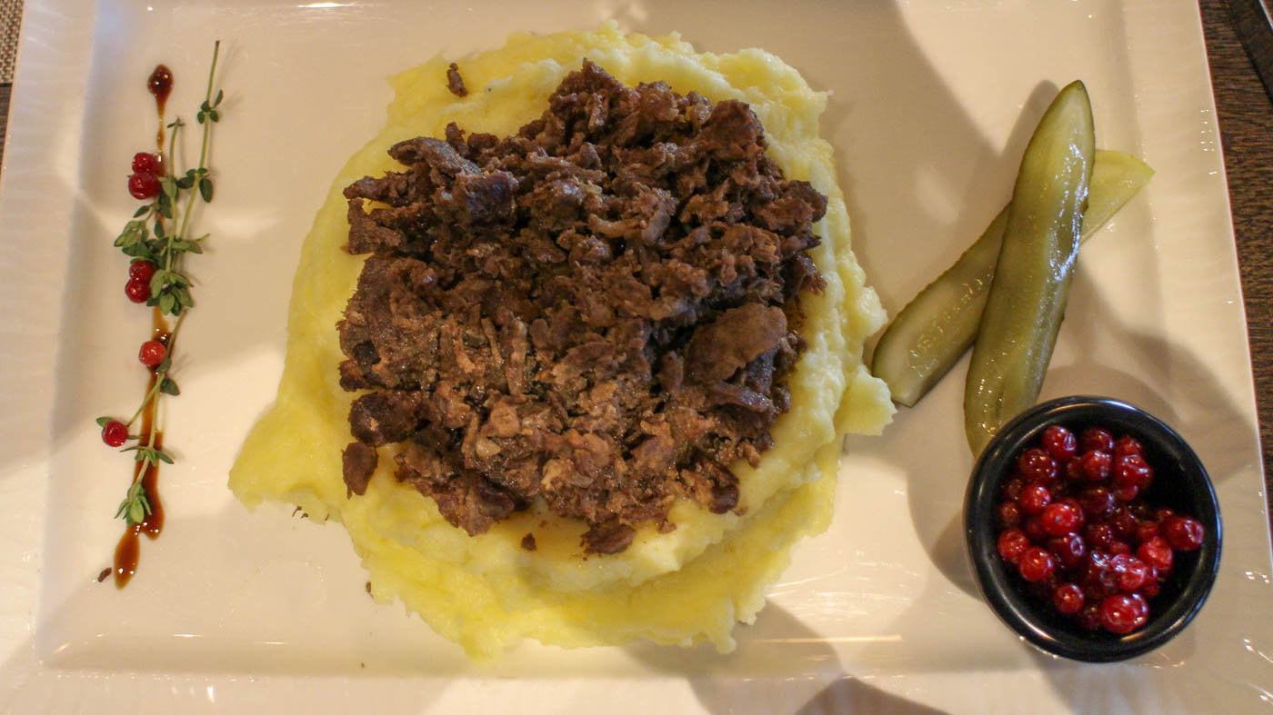 In het ski dorp hebben we een traditioneel gerecht uit Lapland gegeten; "Poronkäristys" Dit is gestoofd rendiervlees met boter en ui. Het wordt traditioneel geserveerd met aardappelpuree en bosbessencompote. Na een biertje zijn we naar ons hotel (Motel Willes west) gegaan.