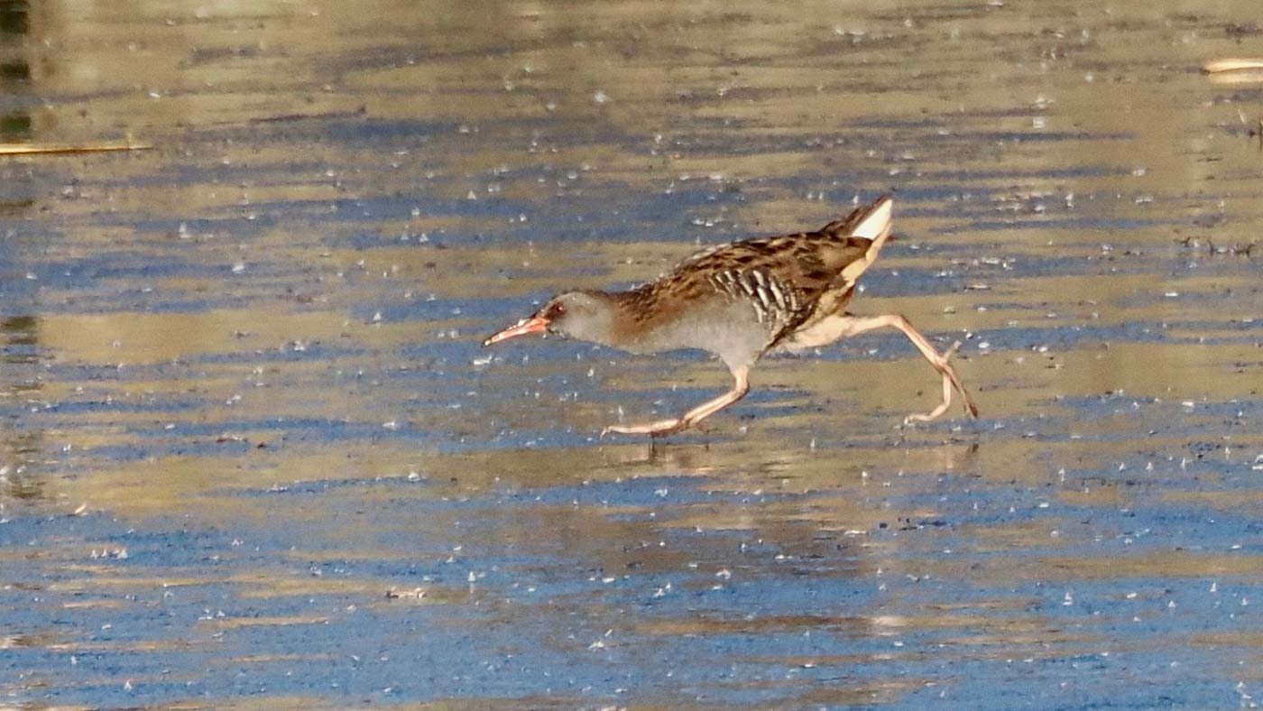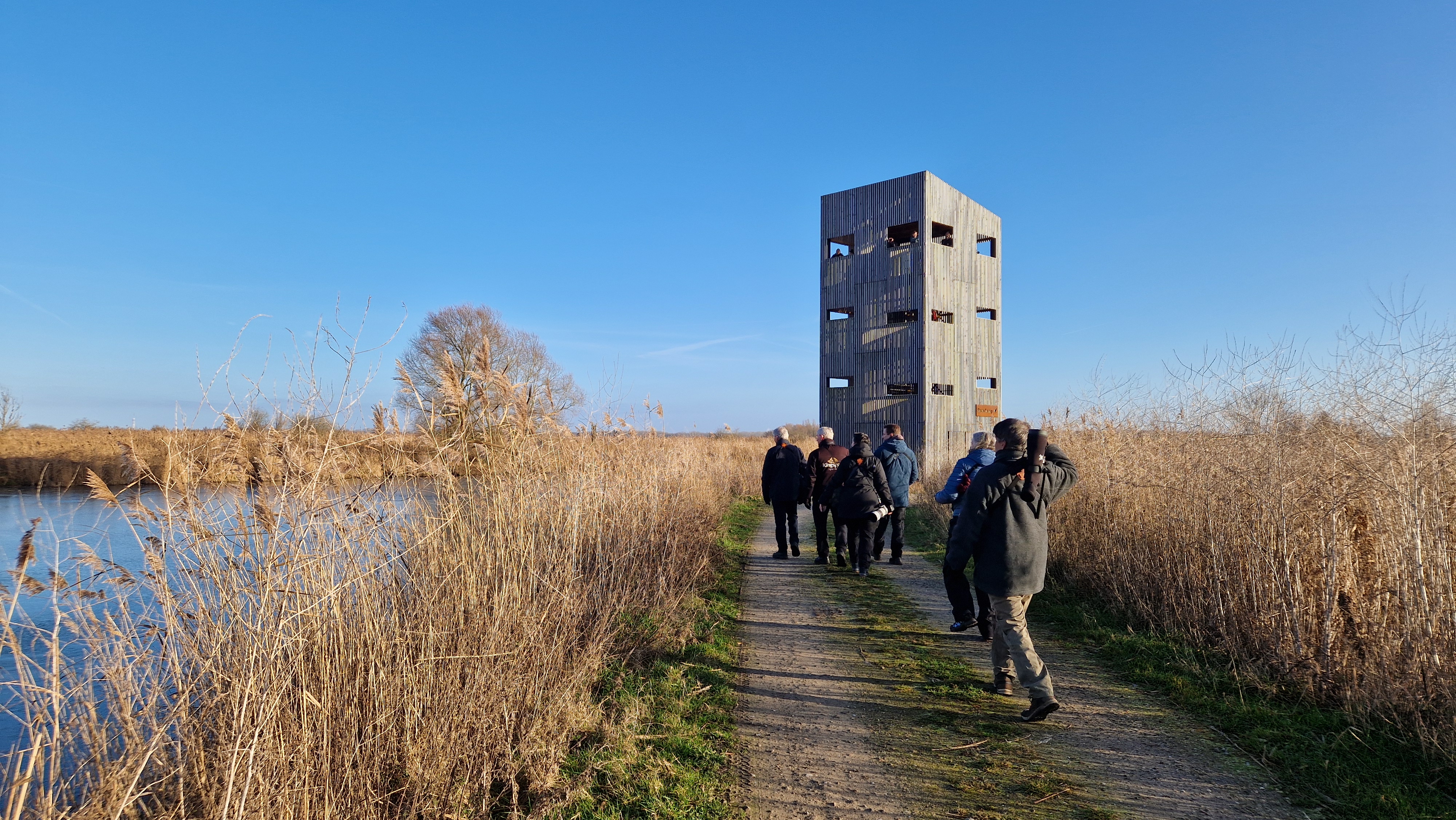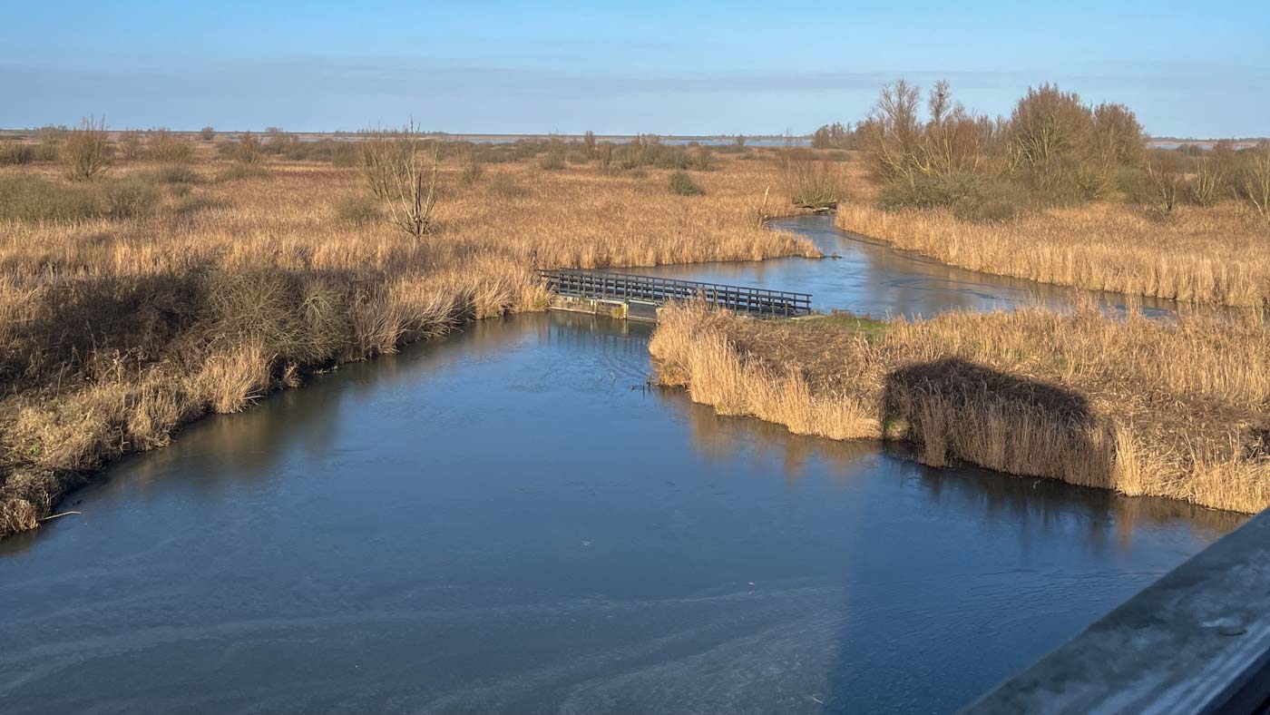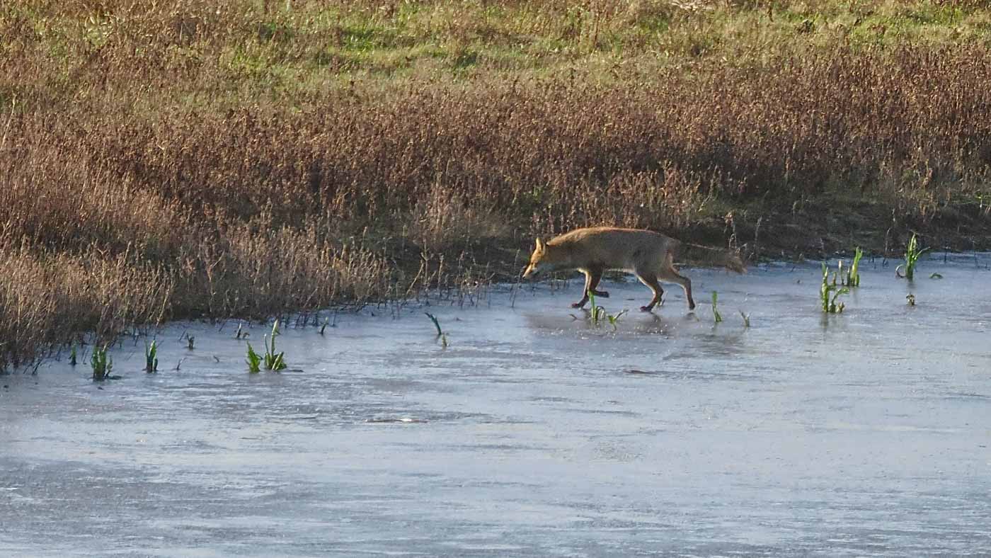 We wandelden verder naar de nieuwe uitkijktoren, een paar kilometer verderop. Hier zagen we de Waterral, die zelfs het ijs overstak (heel leuk en mooi te zien). Ook een Vos liep het ijs over, heel gaaf. In de verte zagen we weer een paar Zeearenden, een Blauwe Reiger stak nog het ijs over, en we zagen zelfs een leuk groepje Baardmannetjes in het riet. Dit moest natuurlijk even goed worden vastgelegd. Maar ja, de Baardmannetjes weten niet wat stilzitten is. Na een tijdje toch gelukt om ze mooi op de foto te zetten.