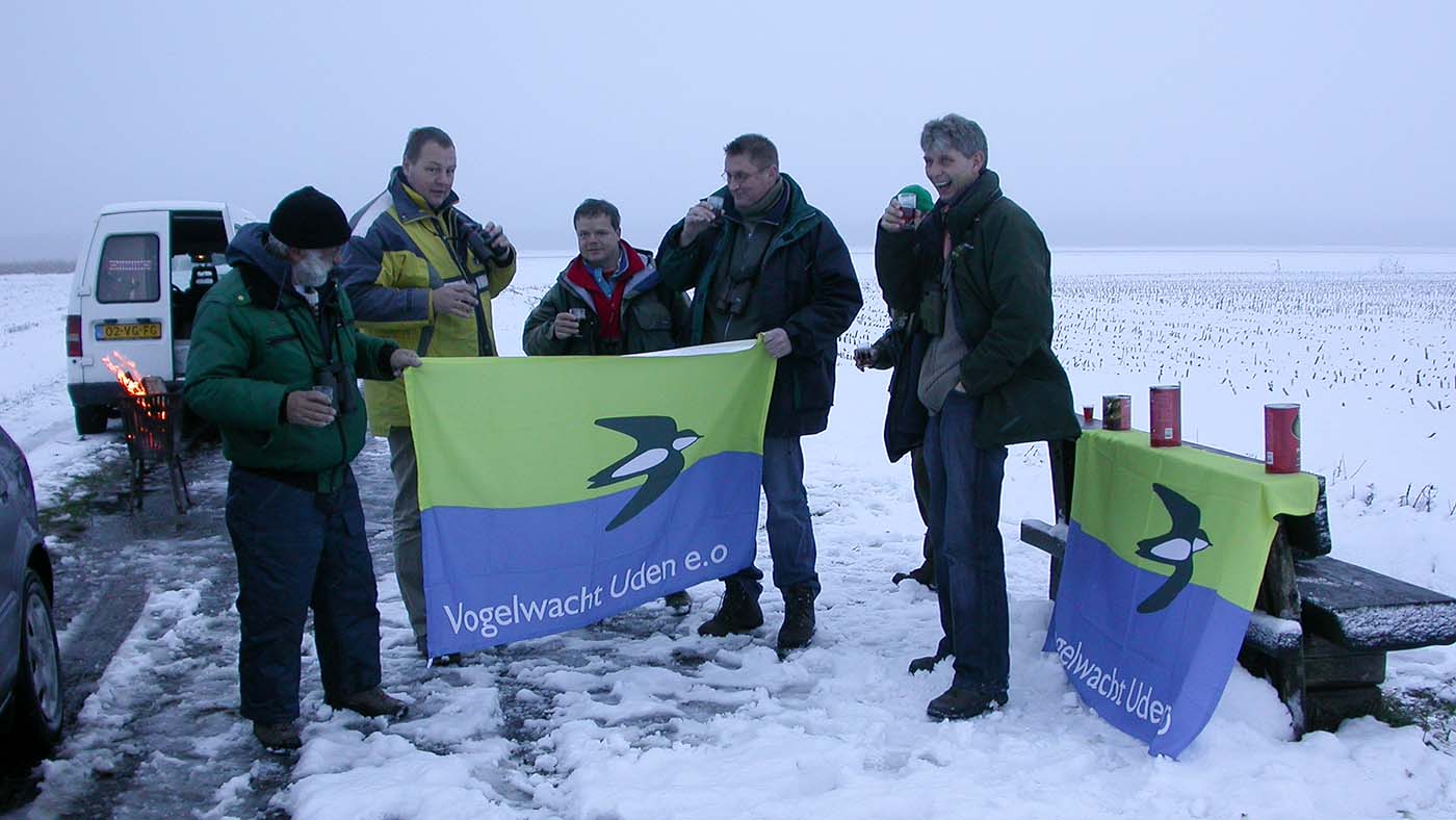 Toen ook op zondag door de meer ervaren tellers twee Grote Mantelmeeuwen werden gezien kwam het beroerde hart weer enigszins tot rust. Die laatste dag is er eigenlijk maar weinig echt geteld maar werd de telling opgevrolijkt door een drankje en een hapje bij de houtkachel in de sneeuw. Vogels werden dus niet veel gezien maar wel een heel erg rare onbekende: ter grootte van Kramsvogel maar lichter van onder en geen staart! Misschien was dit wel de raarste vogel van het seizoen… het was in ieder geval wel de laatste!!
